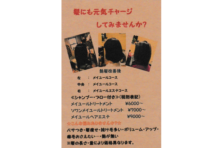 髪質やダメージが気になるなどのお悩みを改善できる施術もご提案できますので、気軽にスタイリストまでご相談いただければと思います。営業時間は、9:00~19:00までで、駅までの送迎、ナイト営業、訪問美容にも対応しており、予約優先制のヘアサロンですので、ご来店の際はお電話またはメールにてご予約ください。